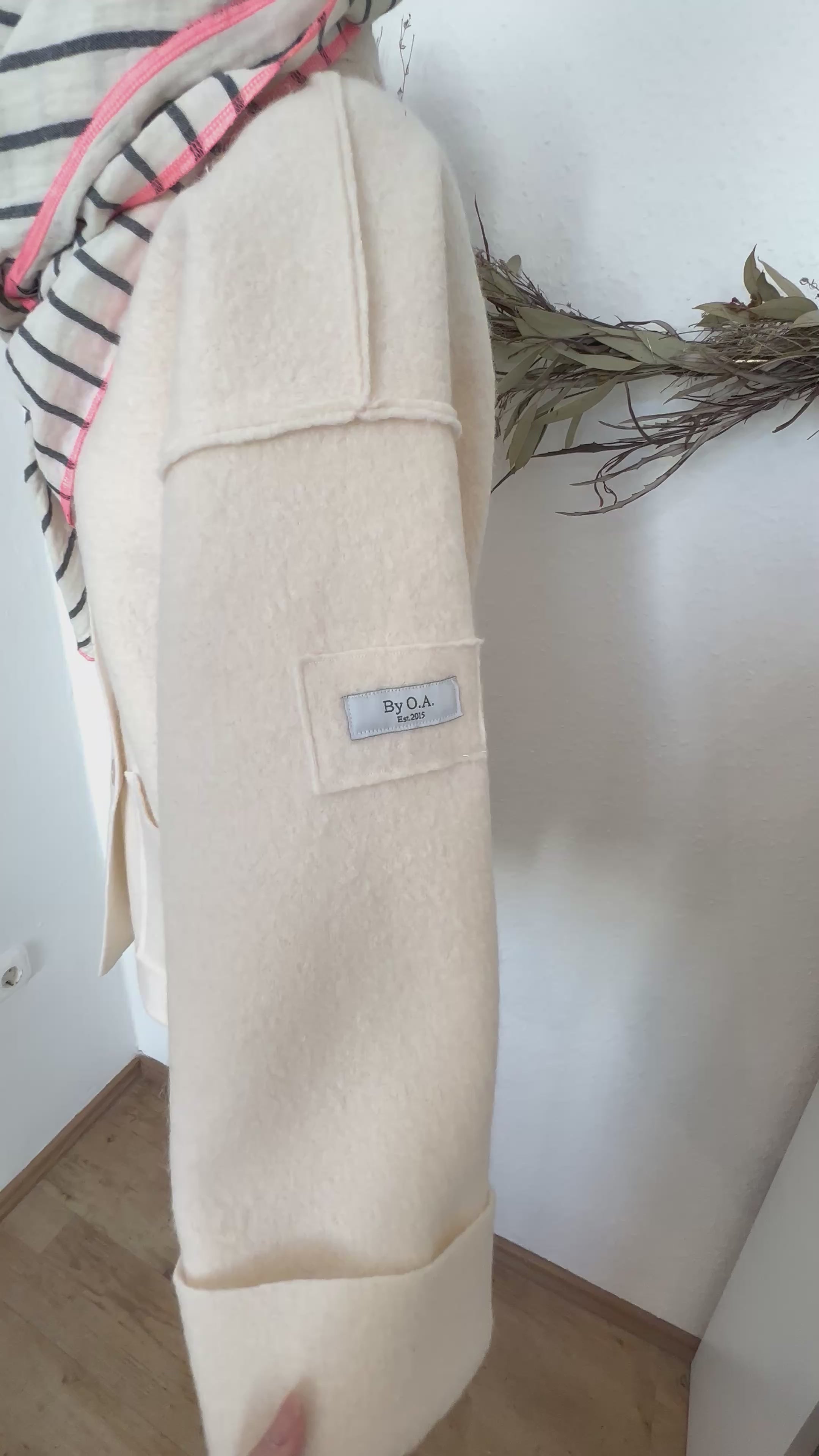 Ein liebevoll gefertigtes Unikat in einem wunderschönen Beige-Ton. Vier Knöpfe, zwei große Taschen, lässige Ärmel und bewusst nach außen gearbeitete Nähte verleihen ihr einen frechen, besonderen Charakter. Sie lässt sich elegant kombinieren oder ganz entspannt im Alltag tragen.